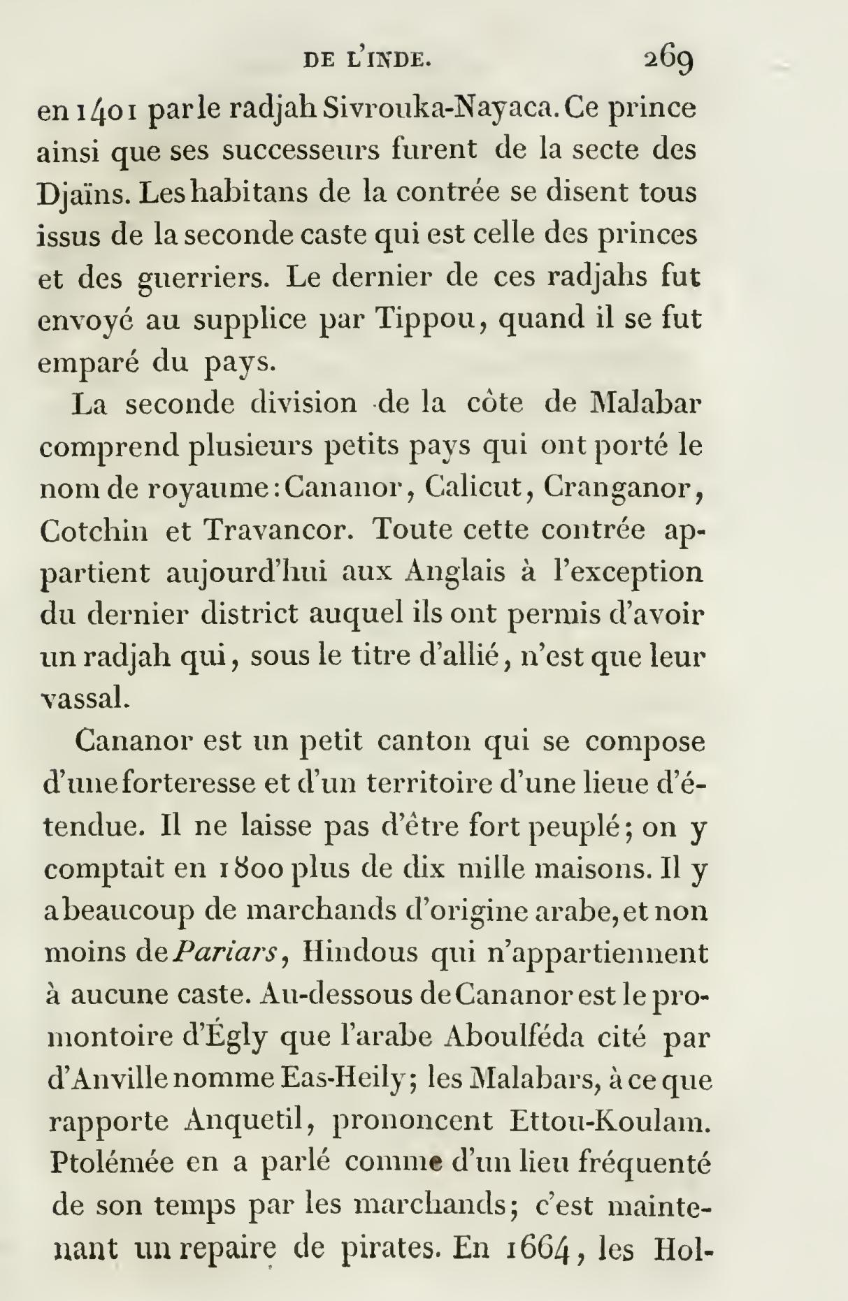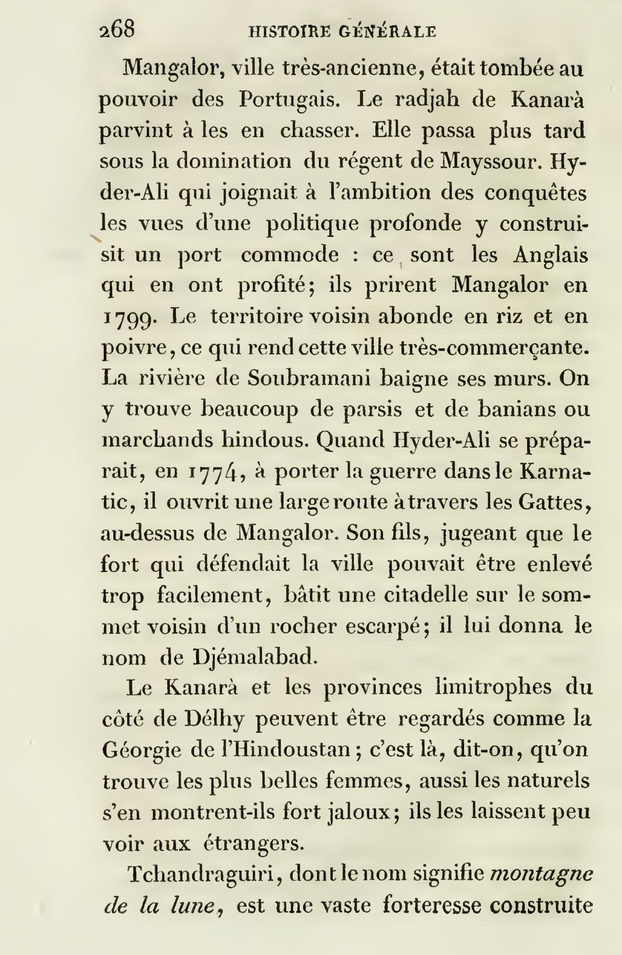 « Tchandraguiri (montagne de la Lune) ; c’est une vaste forteresse bâtie à 12 lieux sud de Mangalore sur le bord méridional d’une rivière du même nom, qui sépare les deux divisions hindoues nommées Malayâla ou Malabar, et Toulava. On attribue la fondation de Tchandraguiri au premier prince de la dynastie des Ikéry, nommé Sivroupa-Nâyaka, qui établit son autorité sur cette partie du Kânara vers 1401 de J. C. Il construisit, dit-on, le fort de Cassel-Goda, quand il soumit les petits Râdjahs du Toulava. »