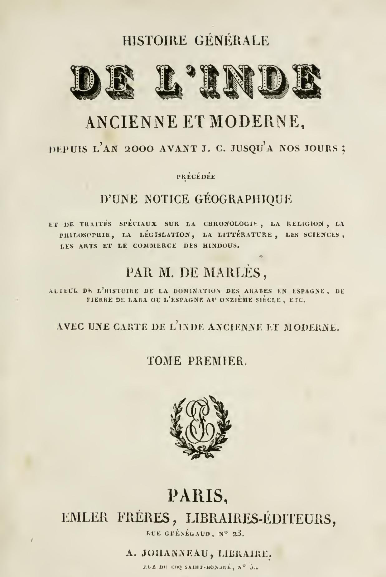 [1]. De Marlès, Histoire générale de l’Inde ancienne et moderne, depuis l’an 2000 avant J. C. jusqu’à nos jours, etc., Paris, 1828, t. I, p. 268-269.