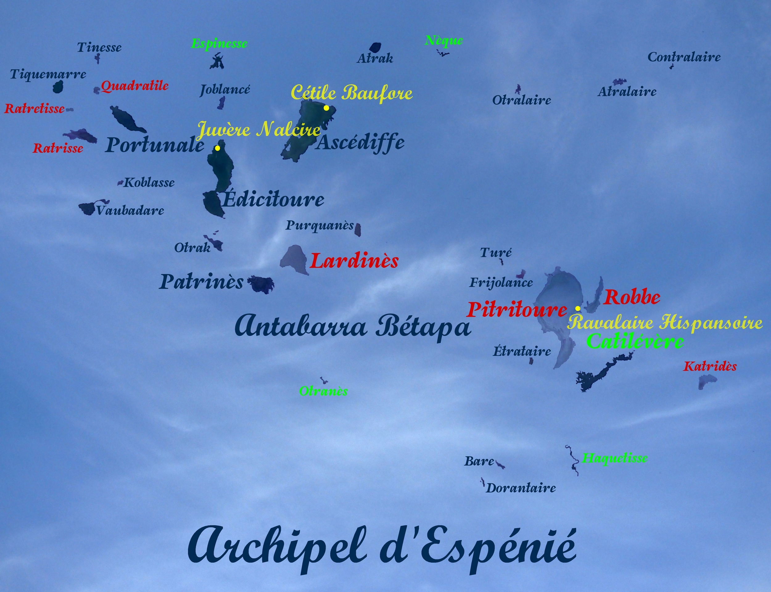 avec la localisation de Ravalaire Hespansoire sur l’île de Pitritoure, de Cétile Baufore sur l’île d’Ascédiffe et de Juvère Nalcire sur l’île d’Édicitoure.