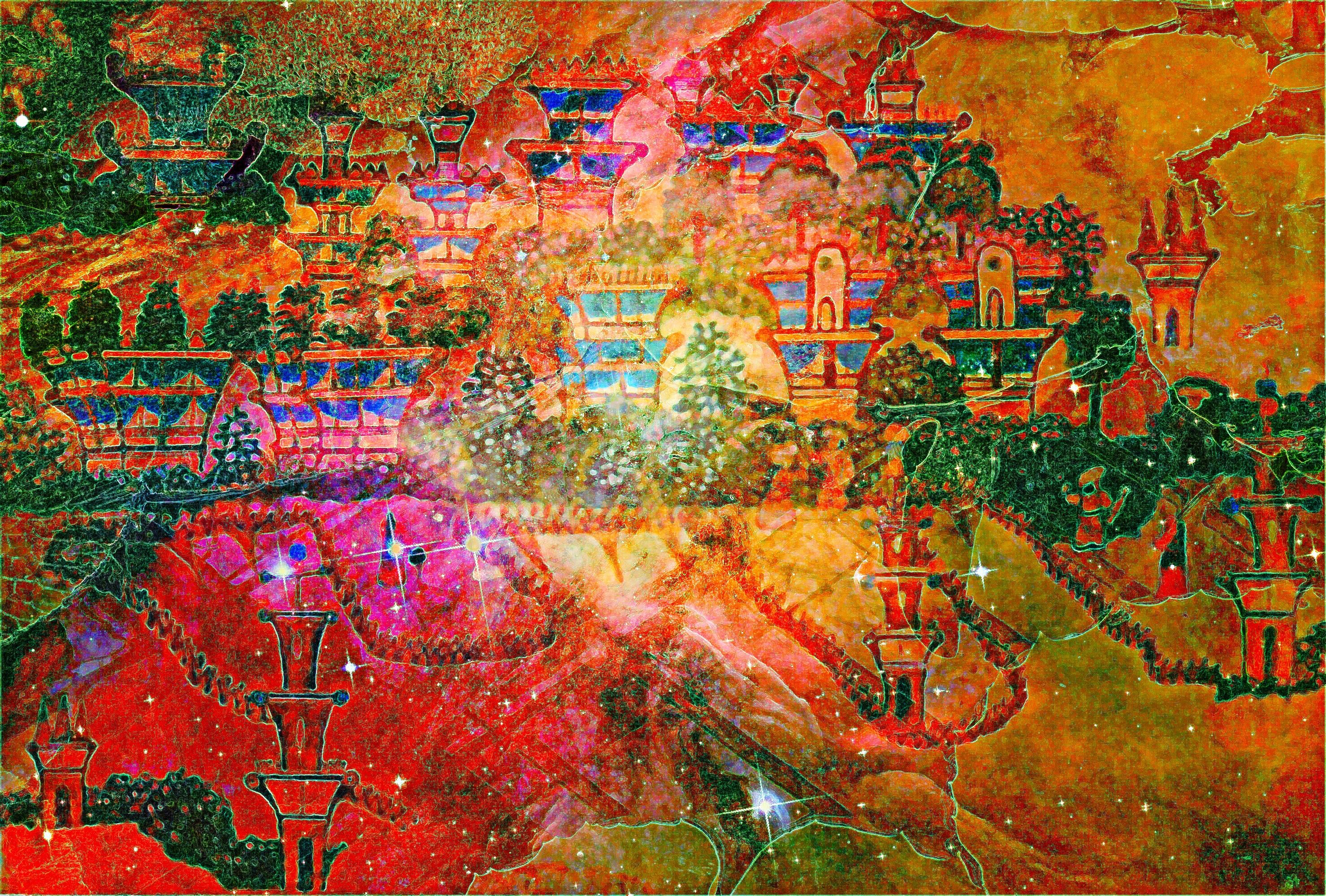 Fig 14. — Paysage martien. — Ciel jaunâtre ; lac verdâtre ; rivages grisâtres bordés d’une barrière brune. Campaniles du rivage dans les tons brun-jaune, avec angles et sommets ornés de boules roses et bleues. Colline de rochers roses, avec végétation d’un vert plus ou moins foncé piqué de taches (fleurs) roses, pourpres et blanches. Édifices à base formés d’un treillis rouge-brique ; arêtes, et angles terminés en trompes rouge-brun ; vastes vitrages blancs avec rideaux bleu turquoise. Toits garnis de clochetons jaune-brun, de créneaux rouge-brique, ou de plantes vertes et rouges (comme celle de la maison d’Astané, fig 12). Personnages coiffés de larges bérets blancs, et à robes rouges ou brunes.