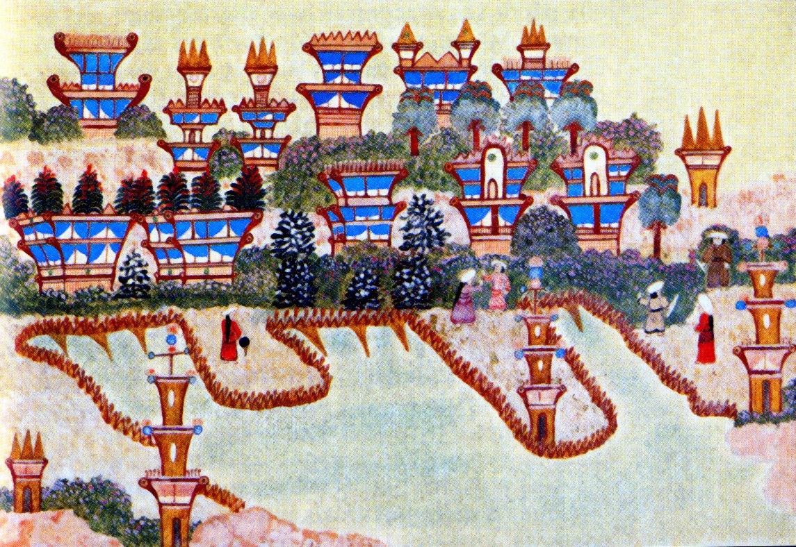 Fig 12. — La maison d’Astané. — Ciel verdâtre ; terrain, montagnes et murs rougeâtres. Les deux plantes à tronc flexueux ont des feuilles pourpres ; les autres sont les longues feuilles inférieures vertes, et les petites feuilles supérieures pourpres. Encadrements des fenêtres, portes, et ornements en formes de trompes, brun-rouge. Vitres (?) blanches, et rideaux ou stores d’un beau bleu turquoise. Barrières (grillages) du toit, jaunes avec extrémités bleues.