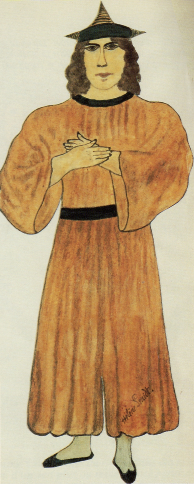 [176] Si Astané n’est donc essentiellement qu’un reflet, une projection de Léopold dans les sphères martiennes, il y a pris une coloration spéciale et s’est extérieurement harmonisé avec ce nouveau décor. Il est vêtu d’une grande robe toute chamarrée et couverte de dessins ; il a de longs cheveux, pas de barbe, « un œil plus haut que l’autre », un teint jaune et foncé, et porte à la main un rouleau blanc sur lequel il écrit avec une pointe fixée au bout de l’index. Il possède là-haut des propriétés et diverses installations qu’Hélène a souvent visitées, dans ses [177] visions spontanées et aux séances, et dont la description ne présente rien de très original, mais semble alimentée par des ressouvenirs des choses d’ici-bas qui se seraient seulement déformés, réfractés bizarrement et sans aucune loi précise, en traversant l’atmosphère du rêve martien.