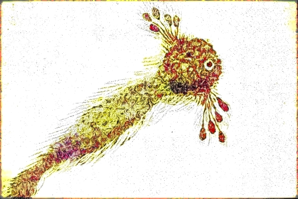 Fig. 18. — La vilaine bête d’Astané. — Corps et queue roses. Œil vert à centre noir. Tête noirâtre ; appendices latéraux jaune-brun, entourés, comme tout le corps de poils roses.