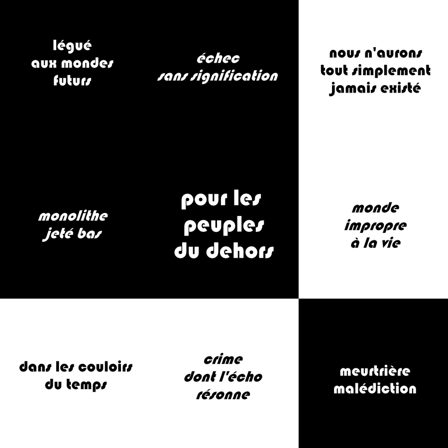 [Ce titre anglais, que jusqu’à preuve du contraire on peut considérer comme authentique, se trouve sur un schéma représentant le « cube » de : Danse des mortes au point du jour. Il a été réalisé par Irma à l’époque où les deux femmes déterminaient quelle serait la structure de ce poème éparpillé, décidant comment ses cryptoglyphes et ses fragments poétiques se répartiraient sur ses neuf faces entre Eingana (fond noir) et Anjea (fond blanc).