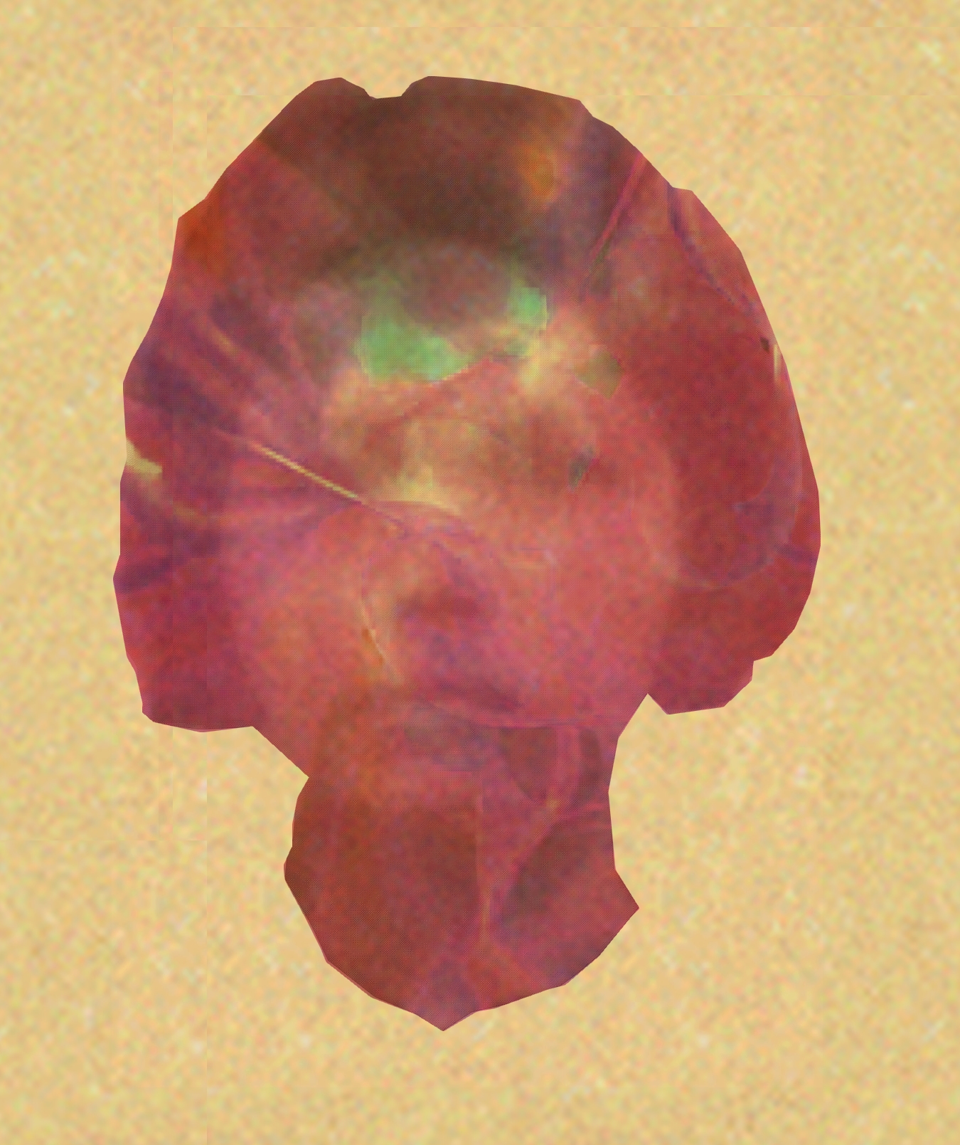 Cette représentation en deux exemplaires symétriques du même visage porte en surimpression :