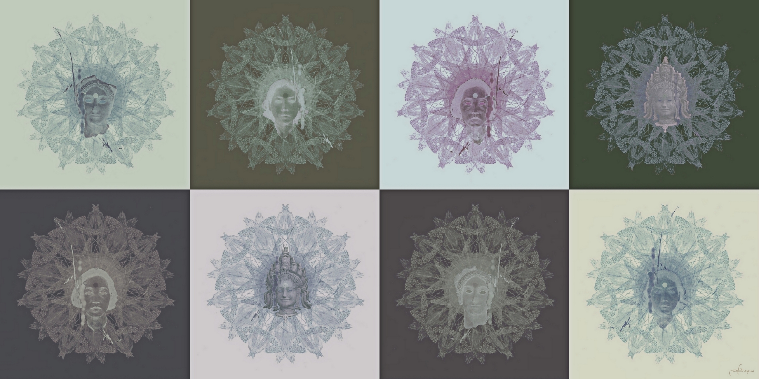 C’est dans ce contexte qu’elle produisit, en 2009-2010, une série de masques-visages inspirés des « œuvres khmères » de S-21, qu’elle dédia à Dénoshay Énaïva, l’inventeur de l’Odradek. Et bien qu’il n’ait certainement pu y avoir la moindre interaction entre elle et le manuscrit LaraDansil, force est de constater que les visages féminins du chapitre 8 se retrouvent sous une forme quasiment identique dans un assez grand nombre de ses compositions d’alors, dont voici un exemple, parmi nombre d’autres :