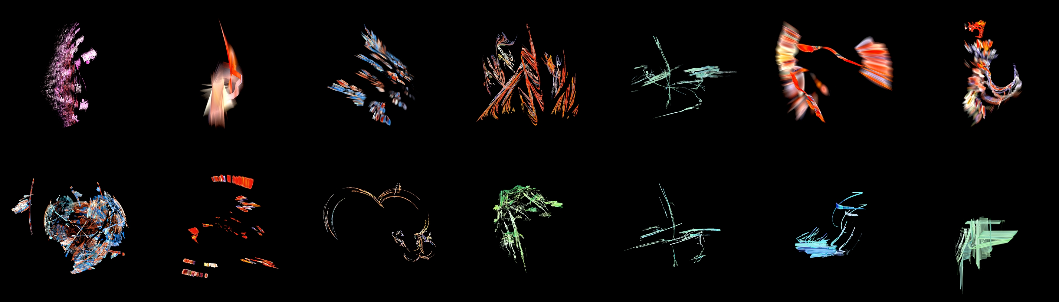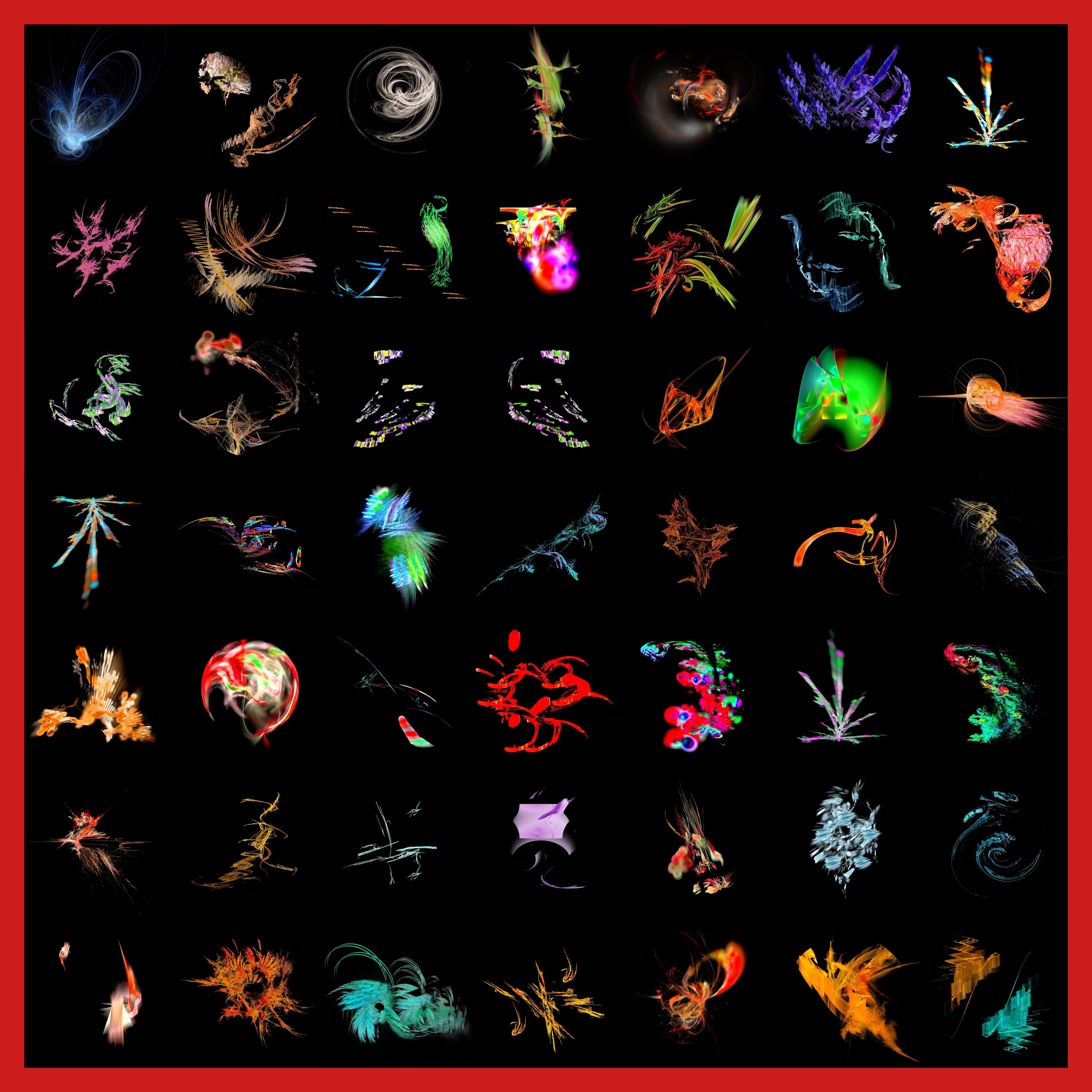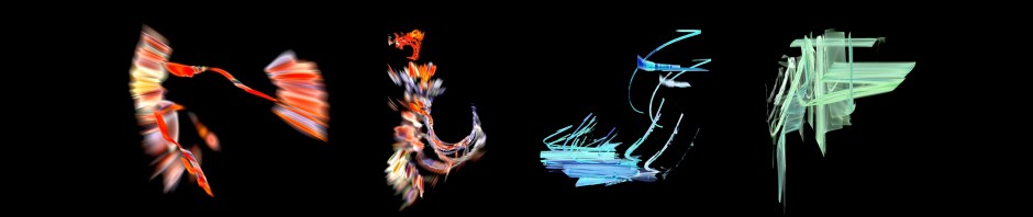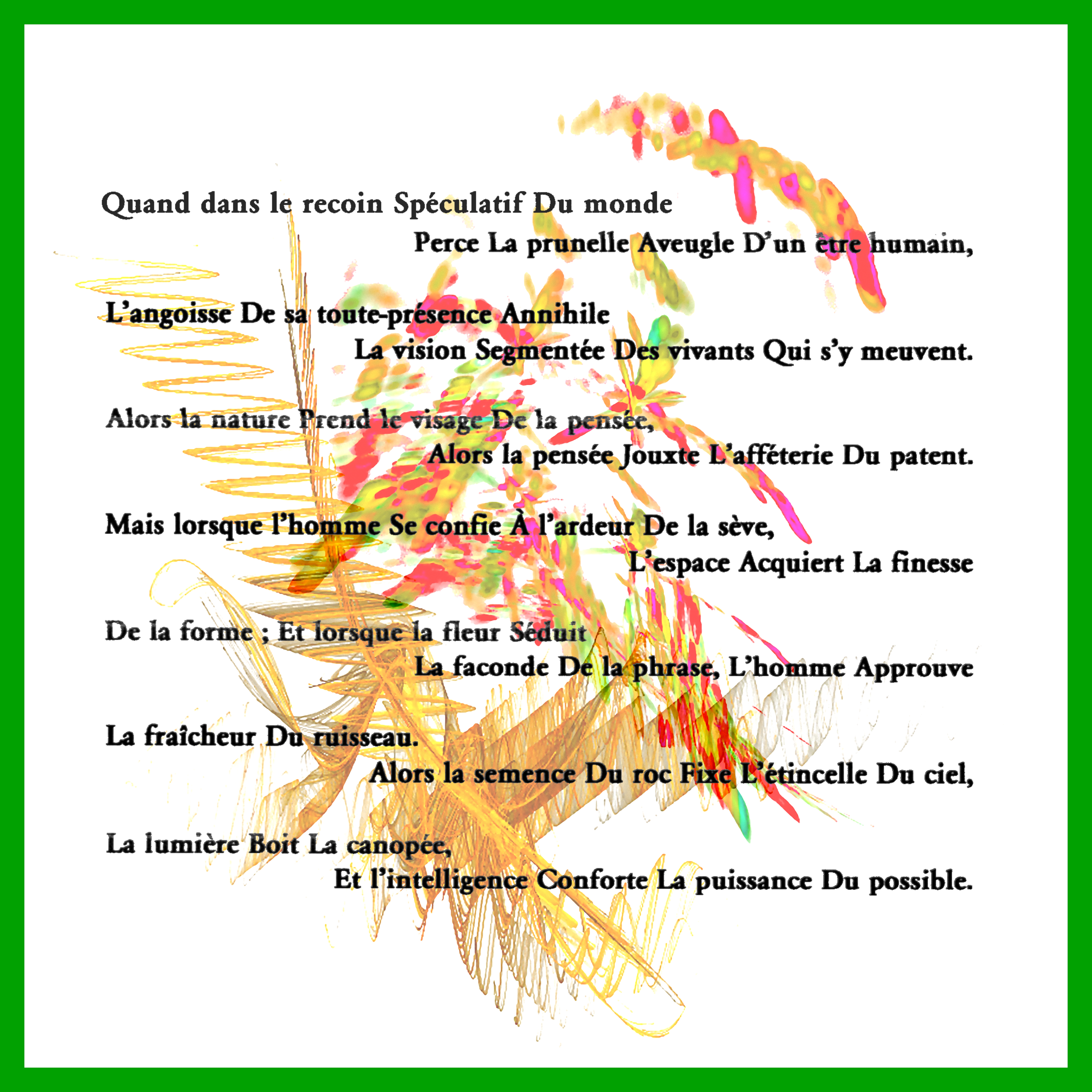 « Je sais que vous avez peine à distinguer, dans mes poèmes, les différentes sortes de motifs « non-figuratifs » que j’y ai placés : je vous accorde qu’ils forment un spectre homogène et continu allant des glyphes purs aux nébulosités structurées. Ll est tout à fait essentiel que vous compreniez qu’existe une véritable distinction entre les glyphes et ce qui vous appelez mes « ectoplasmes ». Les glyphes, parce qu’ils sont des signes inertes, entrent dans la catégorie des « choses pensées mais non pensantes » ; les nébulosités au contraire sont, dans mes tableaux, les représentations de « choses pensantes », d’esprits qui appréhendent le sens de l’être, et ne sont pas eux-mêmes des signes (bien qu’ils puissent se donner mutuellement des noms, c’est-à-dire apprendre à se saluer et à se reconnaître grâce à des signes qui leur appartiendront en propre). D’ailleurs, bien qu’elles ne deviennent des êtres distincts que grâce à leur union avec la matière, ces nébulosités psychiques ont leur source dans « l’autre monde », celui du pérenne, tandis que les signes ne sont, de soi et par soi, dotés d’aucune présence dans le monde de la pensée immatérielle, où ils n’ont aucune pertinence, aucune raison d’être.