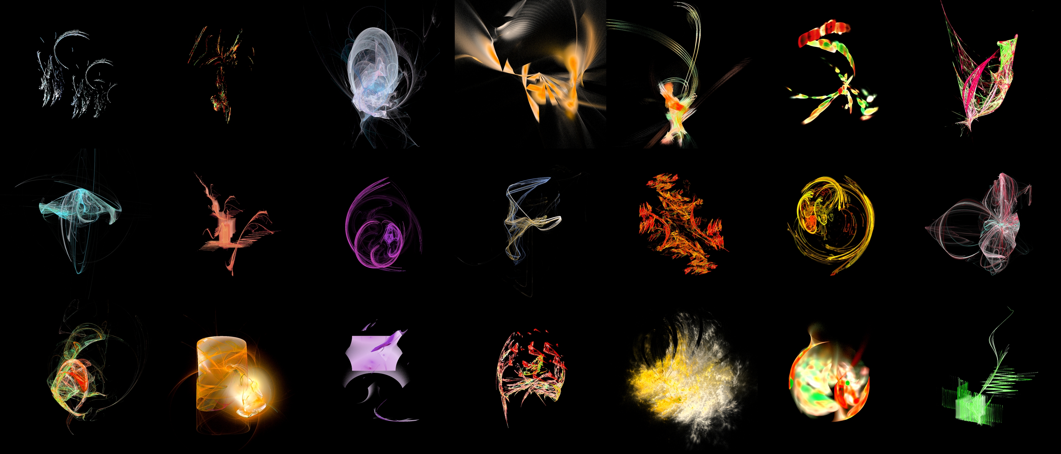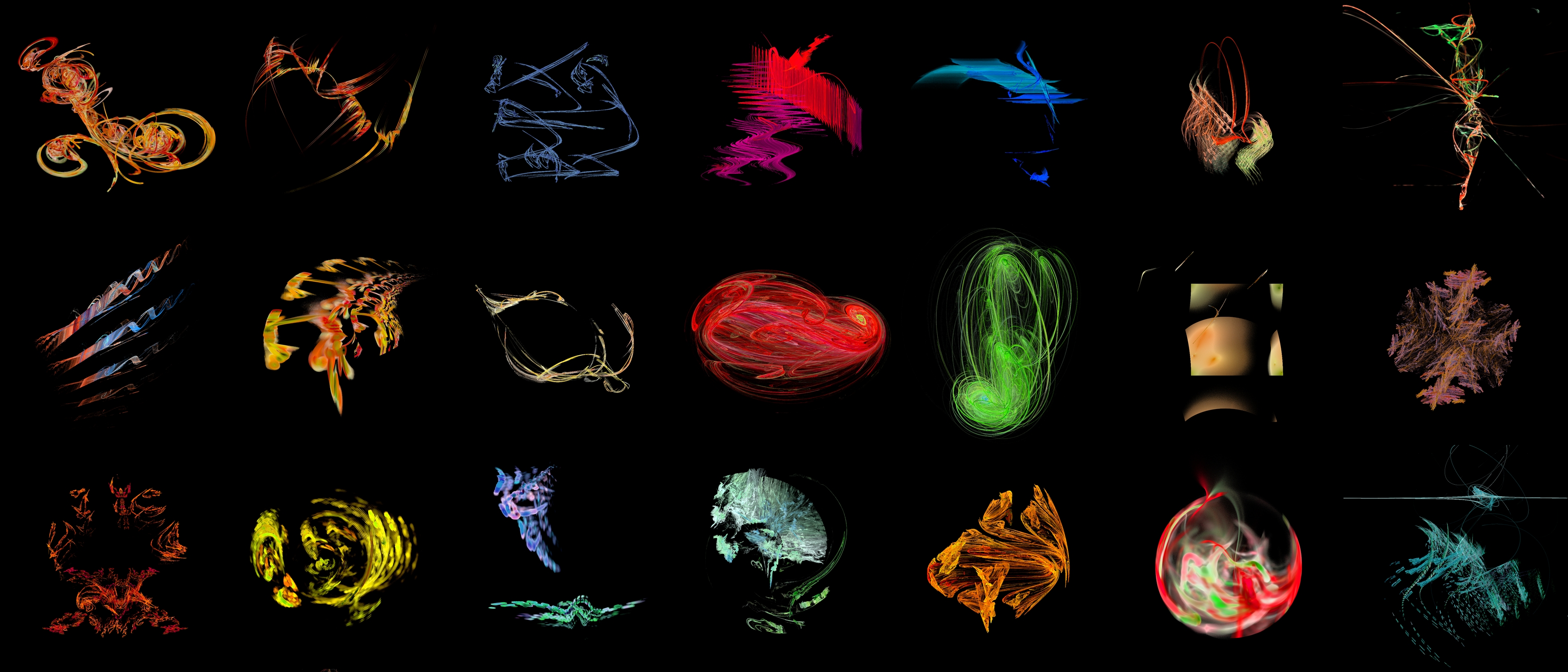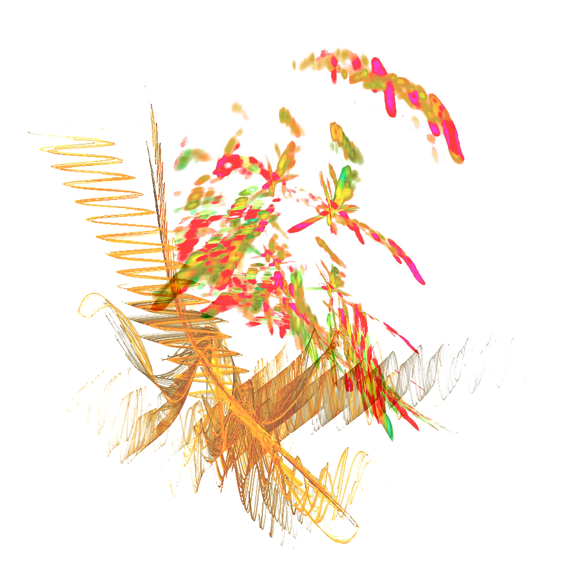 Les emblèmes « réalistes » intègrent une composante qui se rapporte directement au sujet du poème, ce que ne font pas les tableaux « abstraits ». Mis à part ce trait (dont je ne prétends pas sous-estimer l’importance), l’ensemble des emblèmes met en œuvre trois types de motifs « ésotériques ». Il s’agit tout d’abord de cryptoglyphes, ou de signes qui entretiennent avec ceux-ci de forts liens de parenté. Apparaissent ensuite des motifs qui évoquent de près ceux dont nous avons déjà relevé l’existence dans la traduction l’échantillon d’« écriture rubanée » qui traduit d’un passage du manuscrit LaraDansil : ce sont, comme Andrea Berndt-Wieland les appelle, des « nébulosités spectrales ». Viennent enfin des motifs moins structurés, qui seraient, à en croire leur auteure, des « symboles d’affects »