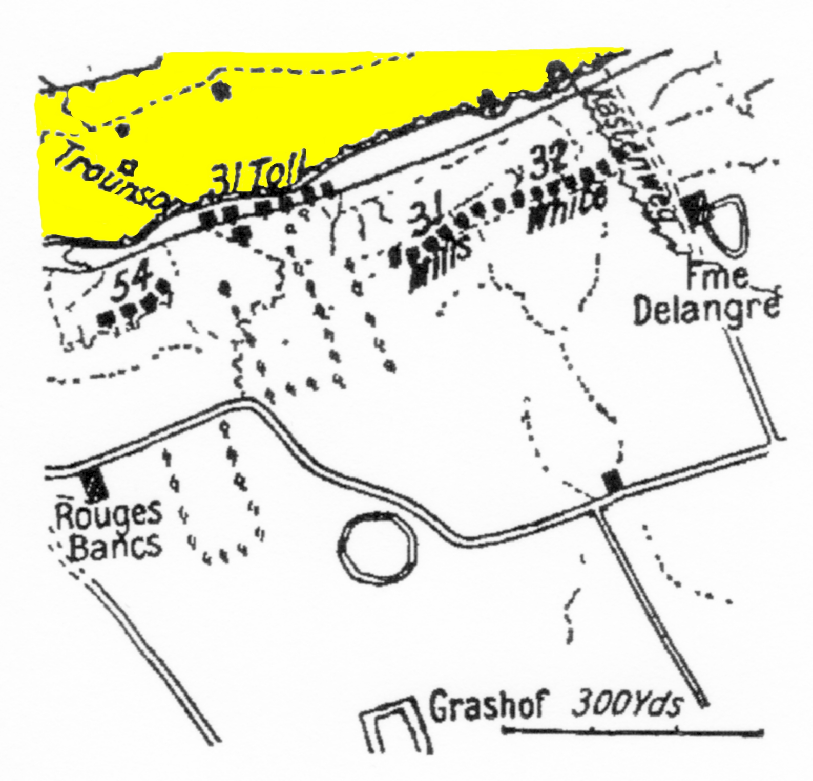En jaune, le No-Man’s Land. Les Alliés sont au nord, les Allemands au Sud