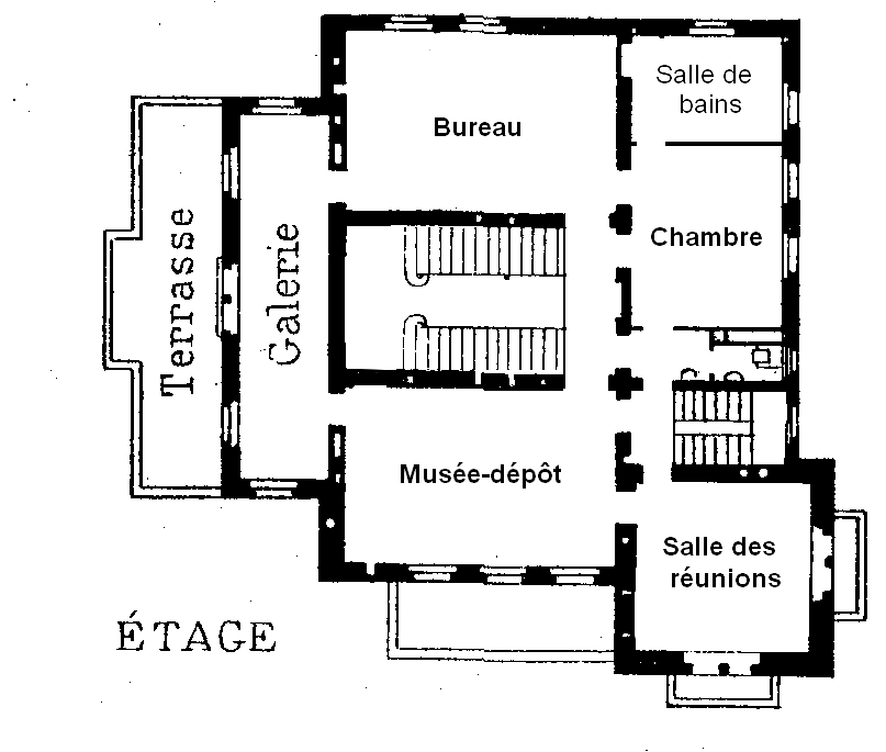 Au premier étage, on retrouve la même répartition en deux zones d’activités, avec cette fois, pour la partie réservée au gardien, une chambre et une salle de bains, et pour la partie commune : au-dessus de la tranéï, une salle de réunion informelle ; au-dessus de la salle d’étude, un jardin d’hiver ; et au-dessus de la bibliothèque, une sorte de musée dédié à la planète Toèva. Un second escalier, à côté de la salle de réunion, mène au belvédère qui coiffe l’ensemble.