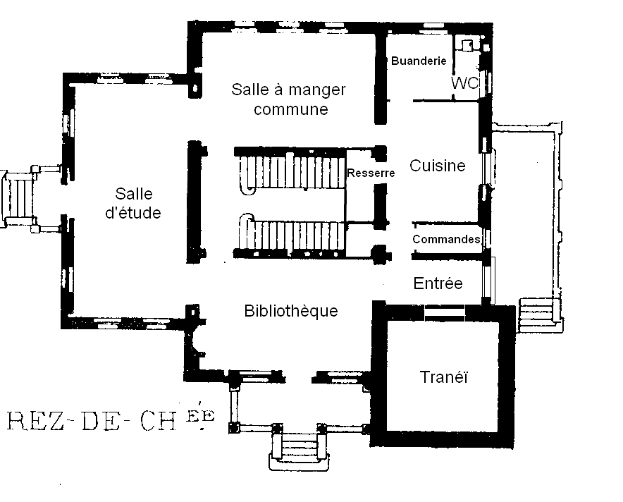 Au rez-de-chaussée, se trouvent, outre la tranéï proprement dite, une partie du domaine propre du gardien, avec cuisine, buanderie et « cabine de commandes » du miza, ainsi que des locaux communs, qui comprennent une salle à manger, une salle de travail et une bibliothèque.