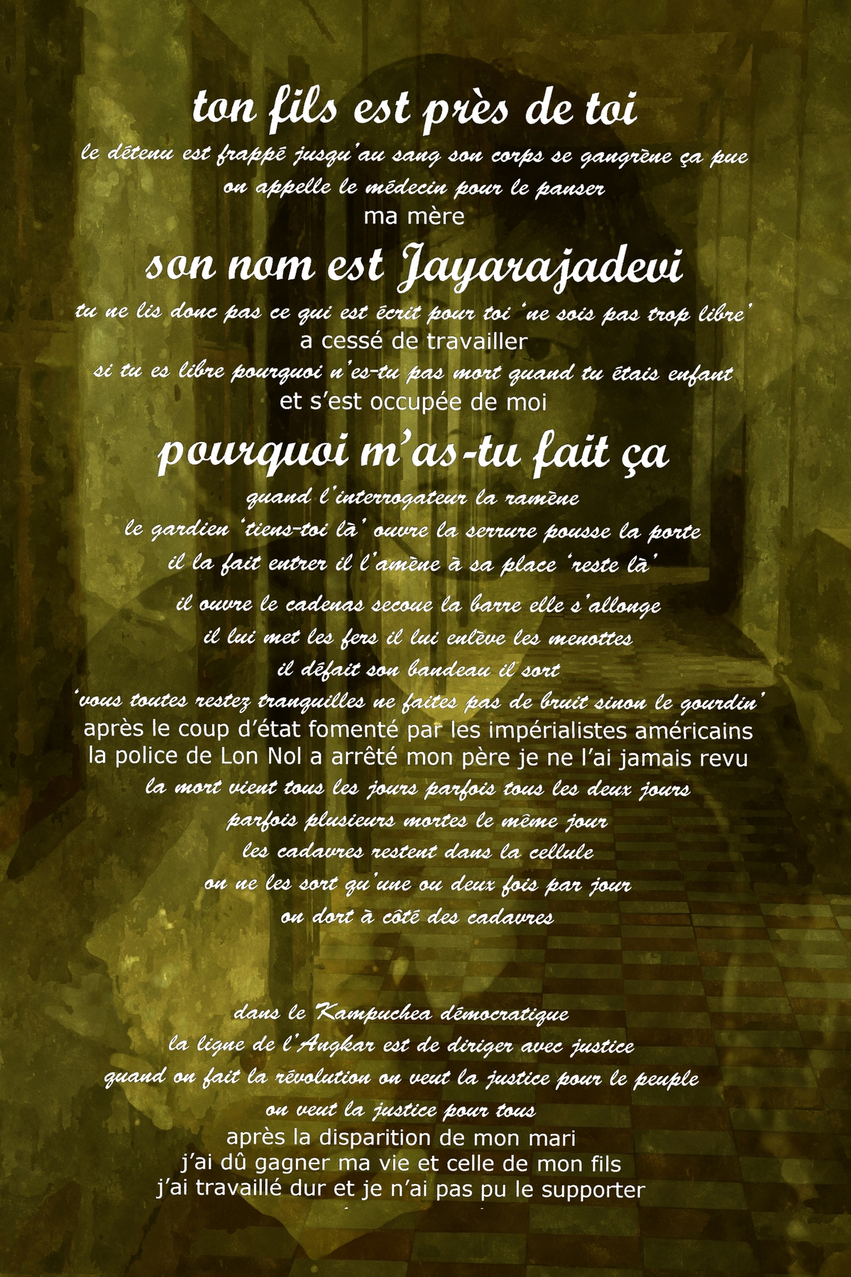 Nous savons en effet, grâce au Cahier khmer, retrouvé après sa mort dans les affaires personnelles de S-21, que le jeune prisonnier, dans son système de fantasmes d’angoisse liés à l’horreur de Tuol Sleng, avait donné à sa mère le nom de : « Jayarajadevi » (« La déesse du Roi de la Victoire »).
