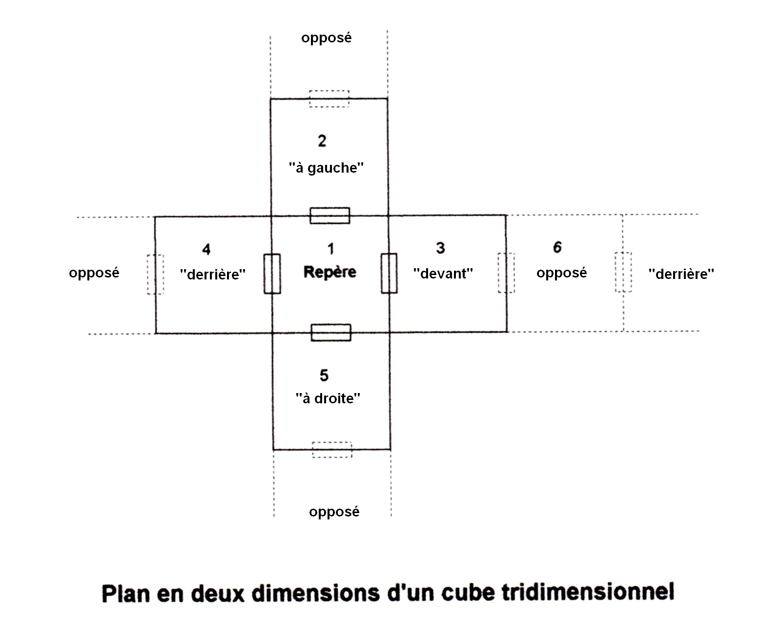 Un être bidimensionnel utilisant un miza tridimensionnel pénétrerait, par l’un de ses coins, dans un carré (marqué ci-dessus : 1 — Repère) lui offrant quatre destinations (quatre passages — quatre tranéïξ) situées au centre de chacun de ses côtés. Il pourrait par conséquent emprunter l’une ou l’autre des tranéïξ situées « devant lui », « derrière lui », « à sa droite » ou « à sa gauche ».