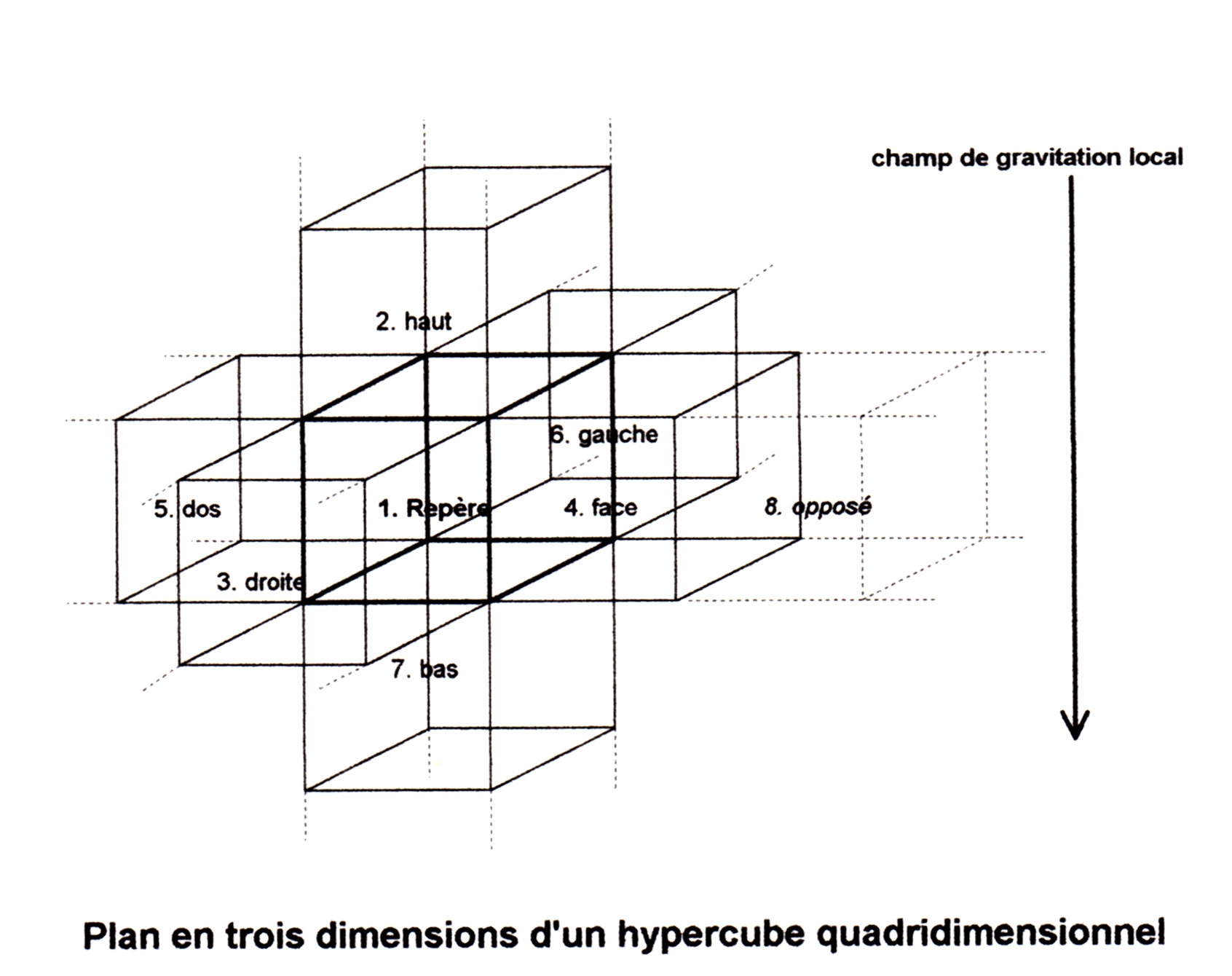 — dans un système spatial quadridimensionnel, coexistent au sein d’un pluricosmos qui, considéré dans sa totalité, serait au moins pentadimensionnel (avec quatre dimensions d’espace et une dimension de temps), en sorte que, dans un système de causalité pentadimensionnel, il est possible d’établir des voies d’interaction « instantanées » d’un espace-temps tridimensionnel à l’autre, à condition que le point de départ et le point d’arrivée soient situés dans des espaces tridmensionnels de chiralité contraire.