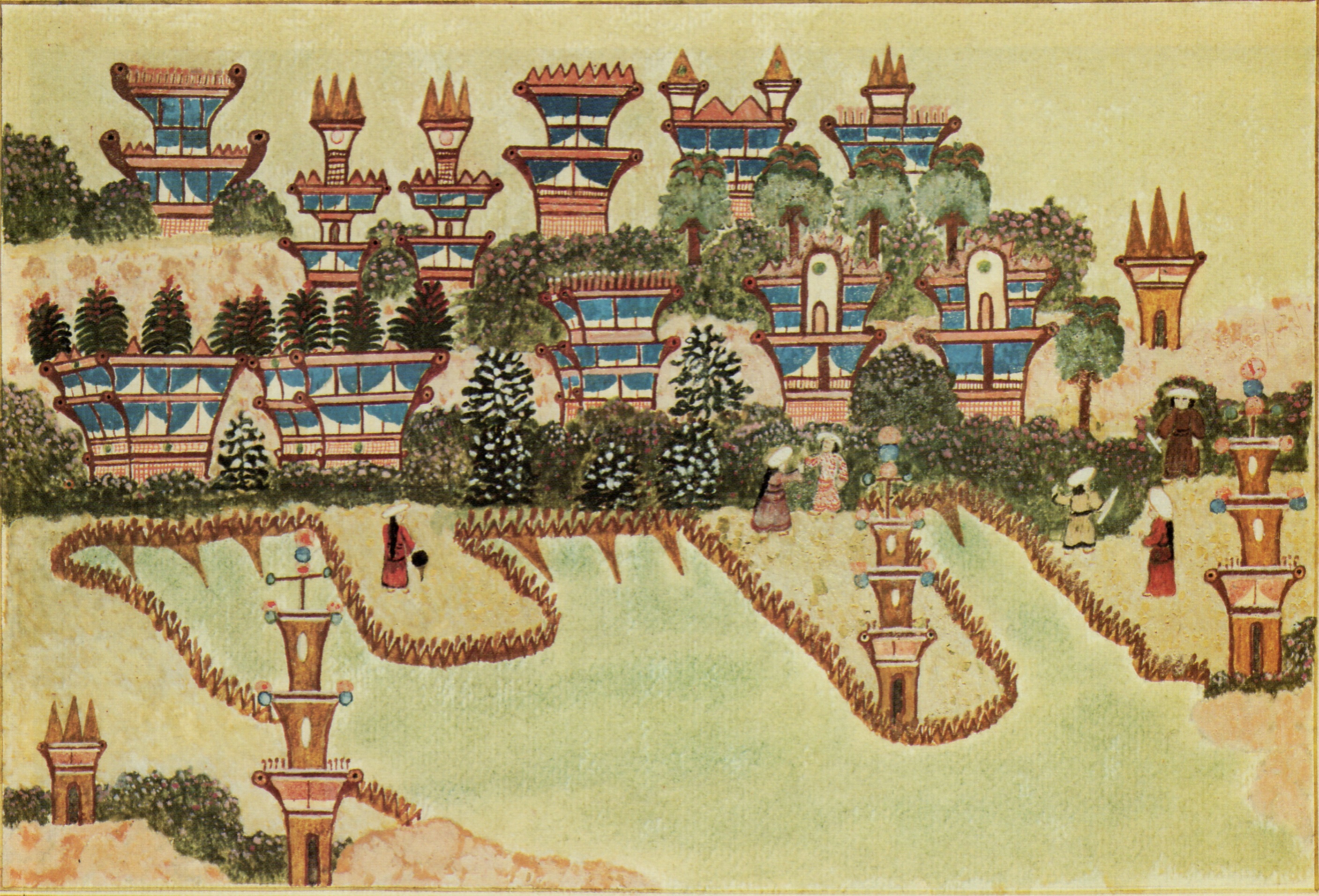 3°. À côté de ces innovations arbitraires et futiles, le roman martien porte, en une foule de ses traits, un cachet nettement oriental sur lequel j’ai déjà souvent insisté. Le teint jaune et les longs cheveux noirs d’Astané ; le costume de tous les personnages, robes chamarrées ou de nuances vives, sandales à lanières, chapeaux plats et blancs, etc. ; les longues tresses des femmes et les ornements en forme de papillons de leur coiffure ; les maisons aux formes bizarres tenant de la pagode, du kiosque, du minaret ; les couleurs éclatantes et chaudes du ciel, des eaux, des rochers et de la végétation ; les lacs aux bords découpés s’avançant en minuscules promontoires garnis d’espèces de campaniles (voir fig. 13 et 14), etc. ; tout cela a un faux air japonais, annamite, chinois, hindou, je ne sais quoi encore, tout à la fois. Il est à noter que cette empreinte d’Extrême-Orient est purement extérieure, ne porte que sur la partie visuelle pour ainsi dire de tout le roman, et ne pénètre aucunement jusqu’aux caractères et aux mœurs des personnages. C’est comme si l’écolier dont je parlais tout à l’heure, ayant vu quelques photographies ou gravures coloriées de ces contrées lointaines, mais sans rien savoir encore de précis sur les coutumes de leurs habitants, avait conservé dans l’œil une impression confuse de tout cet ensemble de formes et de tonalités si différentes de celles de nos pays, puis s’était amusé à répandre ce vernis superficiel d’exotisme sur les images du monde nouveau qu’on le chargeait de créer, de manière à lui donner un aspect aussi original que possible.