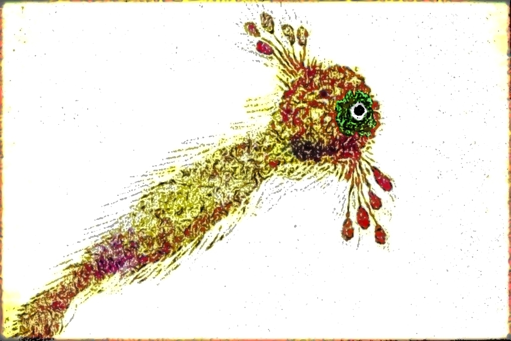 — Eh bien, ces extraterrestres exotiques existent bel et bien en Espénié : Hélène Smith les prit cependant, non pour des êtres pensants rationnels, mais pour de simples animaux, telle la « vilaine bête » à œil unique qui porte la lunette d’Astané, ou bien celles qui ont « la tête large, plate, presque sans poils, et de grands yeux très doux pareils à ceux des phoques », et qui servent de nourrices pour les nouveaux-nés de la crèche martienne. Nous savons aujourd’hui qu’il ne s’agissait nullement d’animaux, comme elle le crut à tort. La « vilaine bête » était un représentant de l’espèce des « Orixas », ou « dieux cavaliers » : cette humanité étrangère qui peuple une très lointaine planète subit, de la naissance à l’âge adulte, trois métamorphoses radicales ; le second de ses quatre stades de développement, celui de la « nymphe », correspond par son apparence à la « vilaine bête »[11]. Et il s’agissait, dans le second cas, de Rajs, ces extraterrestres intelligents originaires de la planète Tèp, qui avaient accepté de participer au projet Dibèle Tolcarre (dont le but était de développer chez les êtres humains un langage tactile de nature affective adapté à la morphologie humaine)[12]. — Sans parler des humanoïdes vivant sur planète Ultra-mars (en réalité la planète Toèva) qu’Hélène Smith nous dépeint comme des êtres « grossiers et primitifs », et dont la langue enchâssée, extraordinairement complexe et subtile, fut à l’origine du projet Minolle Bécarre d’élaboration d’un langage véritablement universel[13].