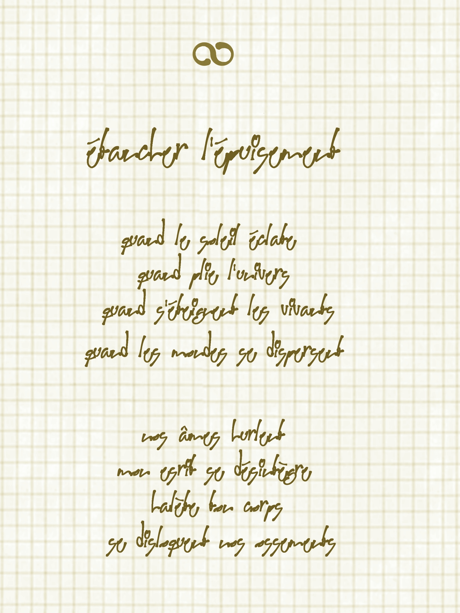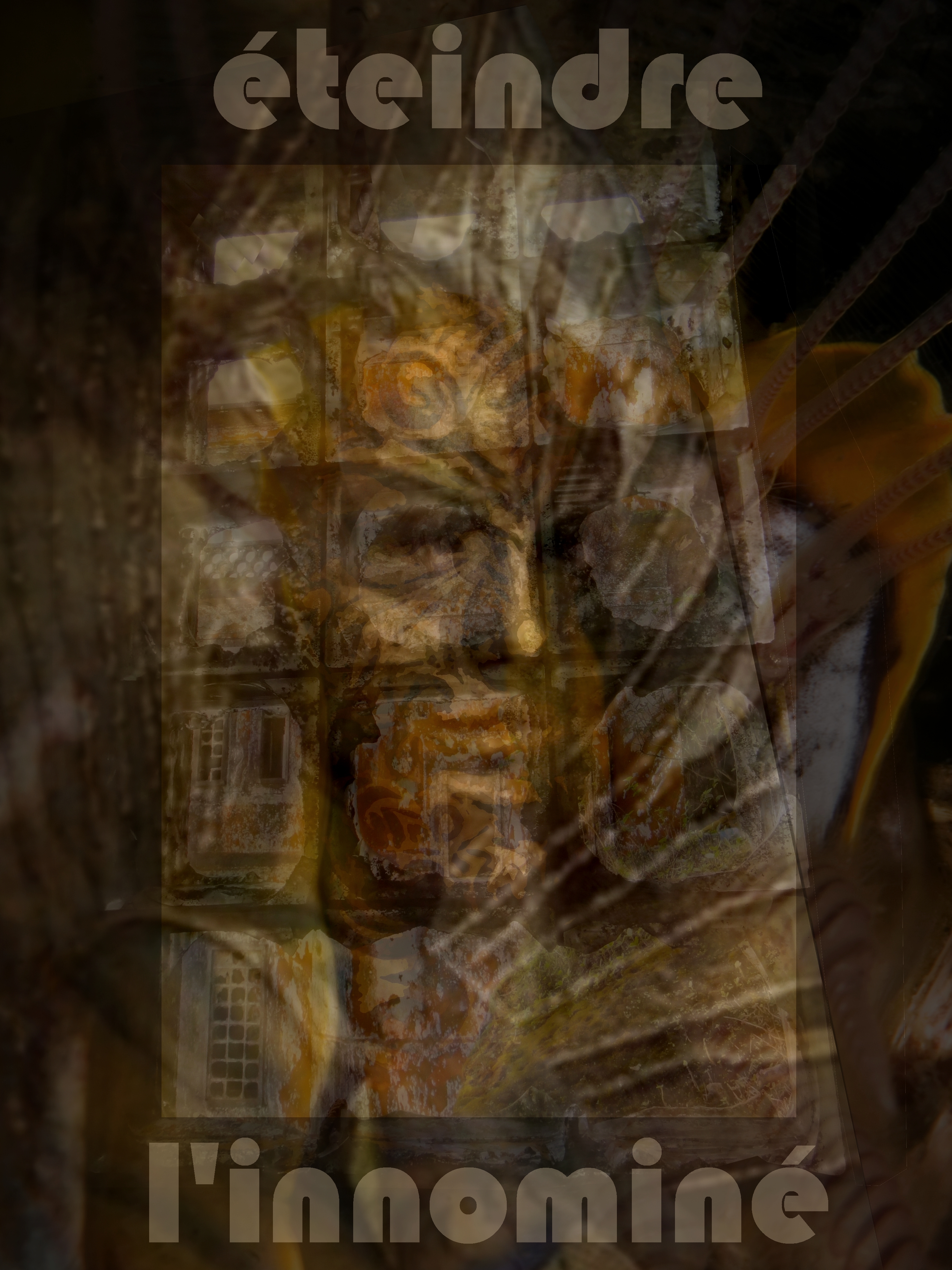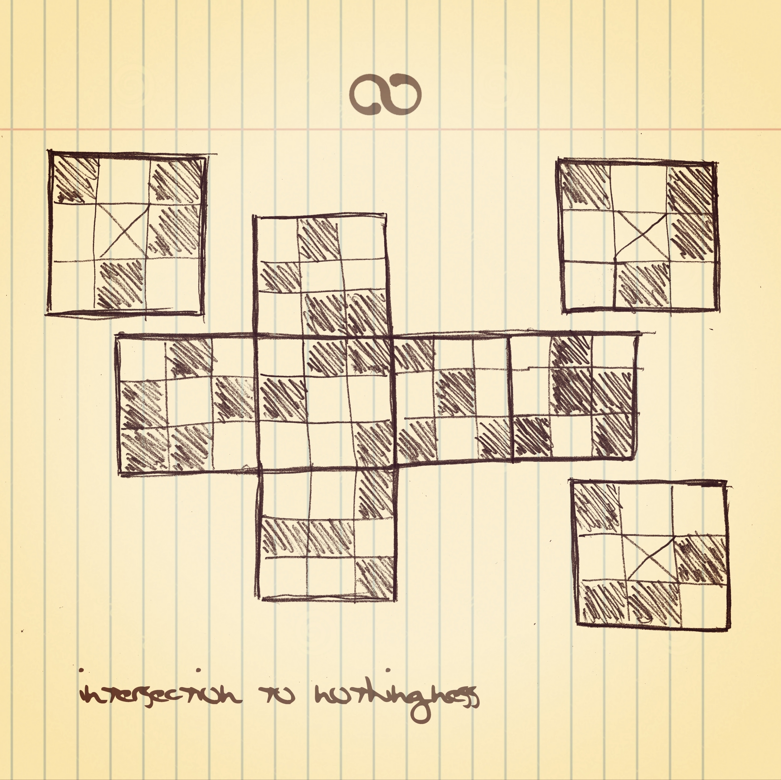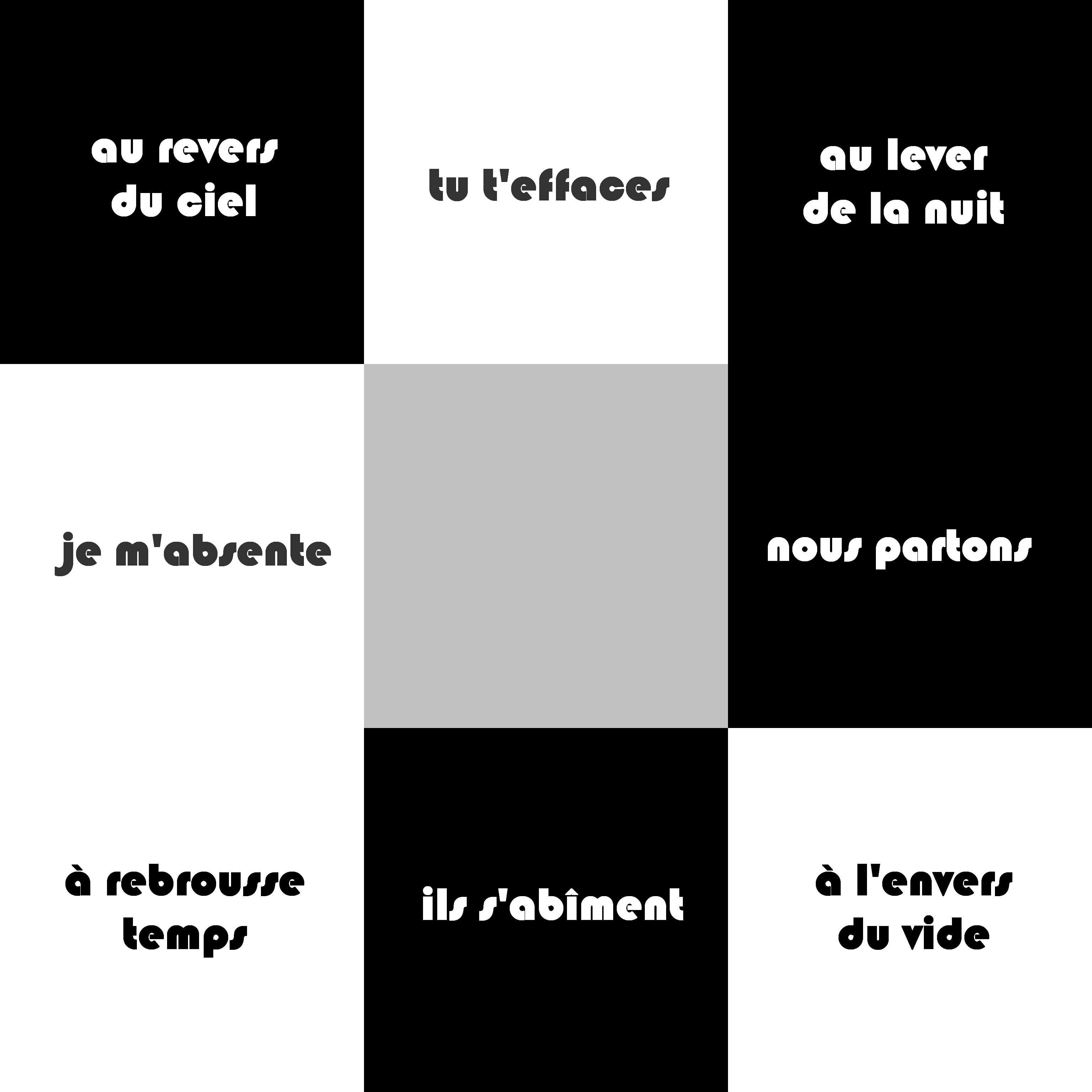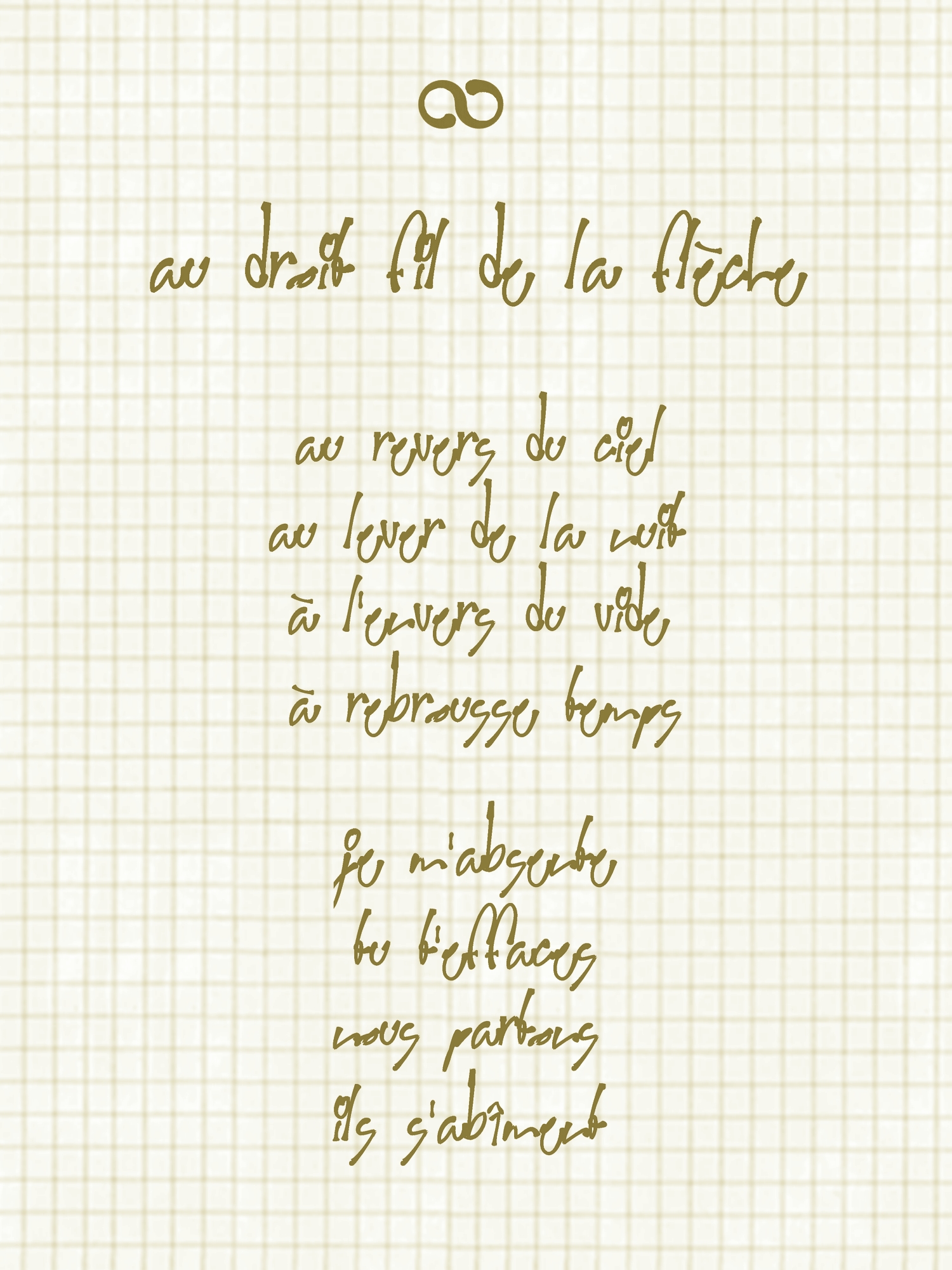 Le poème : ∞. Au carrefour du néant, est demeuré inachevé. Les 6 faces extérieures du cube qui le structure font entièrement défaut, tandis que, des 3 faces intérieures, deux sont complètes, tandis que la rédaction de la troisième a été brusquement interrompue lorsque, tous ses cryptoglyphes ayant été tracés, EingAnjea voulut, par l’entremise d’Ève, rédiger les 8 éclats poétiques destinée à leur correspondre.