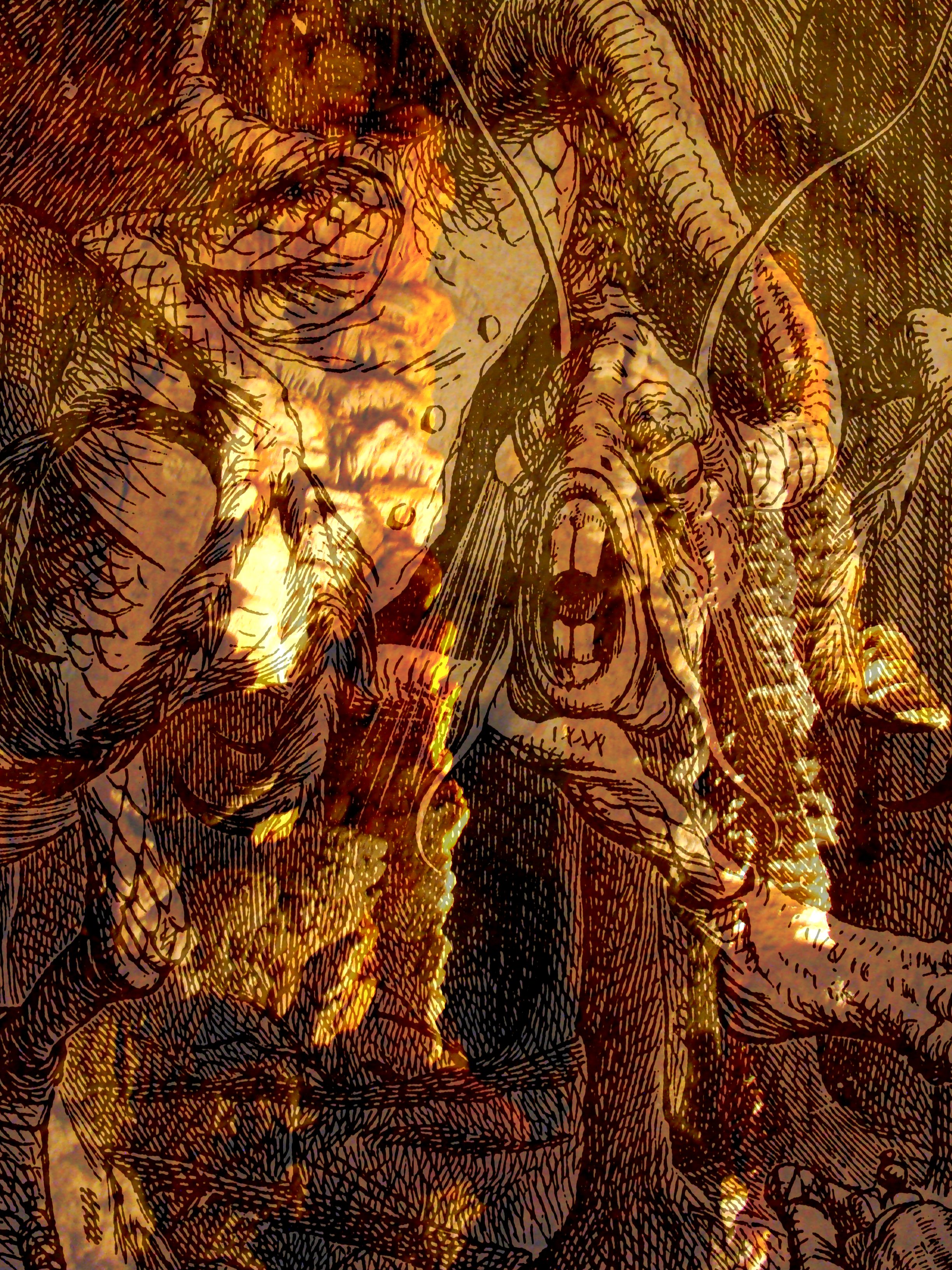 Je ne peux m’empêcher d’y discerner le sourire en demi-teinte du chat du Cheshire. Car tout cela évoque furieusement les néologismes qui parsèment le poème de Lewis Carroll : Jabberwocky, où l’on trouve la description, non de catastrophes naturelles ou technologiques (zi burda, « la bombe »…), comme c’est le cas dans le manuscrit LaraDansil, mais d’un dangereux prédateur :