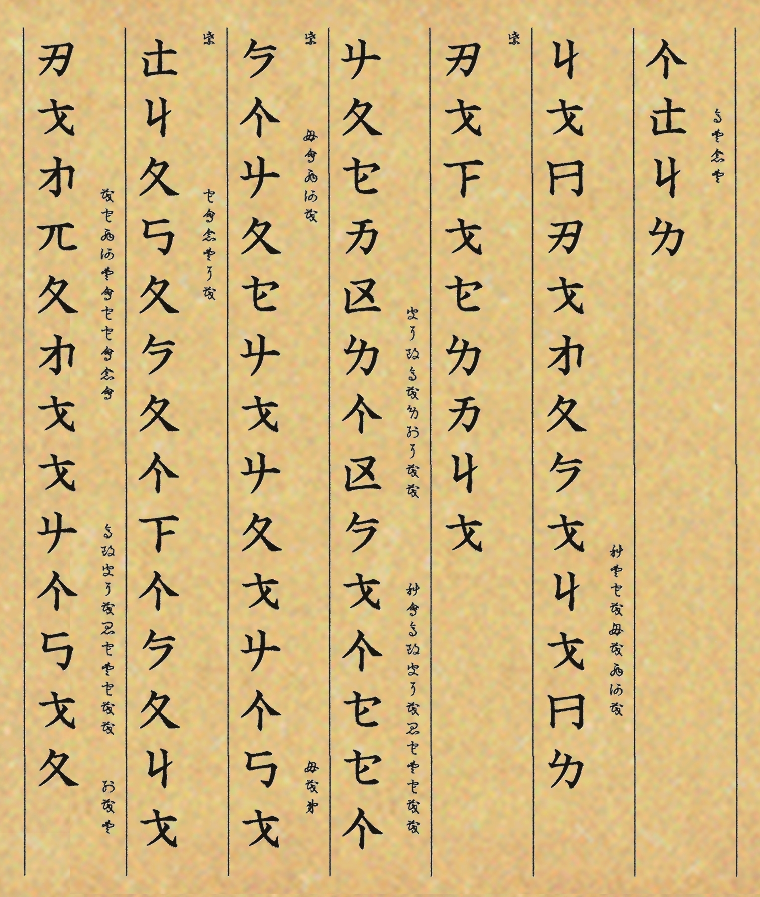 — Leurs « phrases » ne sont pas disposées sur une seule et unique ligne, qui suivrait le déroulement de la parole et imposerait l’ordre de la lecture, mais sur deux colonnes verticales parallèles, cette dualité étant spectaculairement renforcée par la nature des caractères utilisés, « majuscules » à gauche, et « minuscules » à droite.