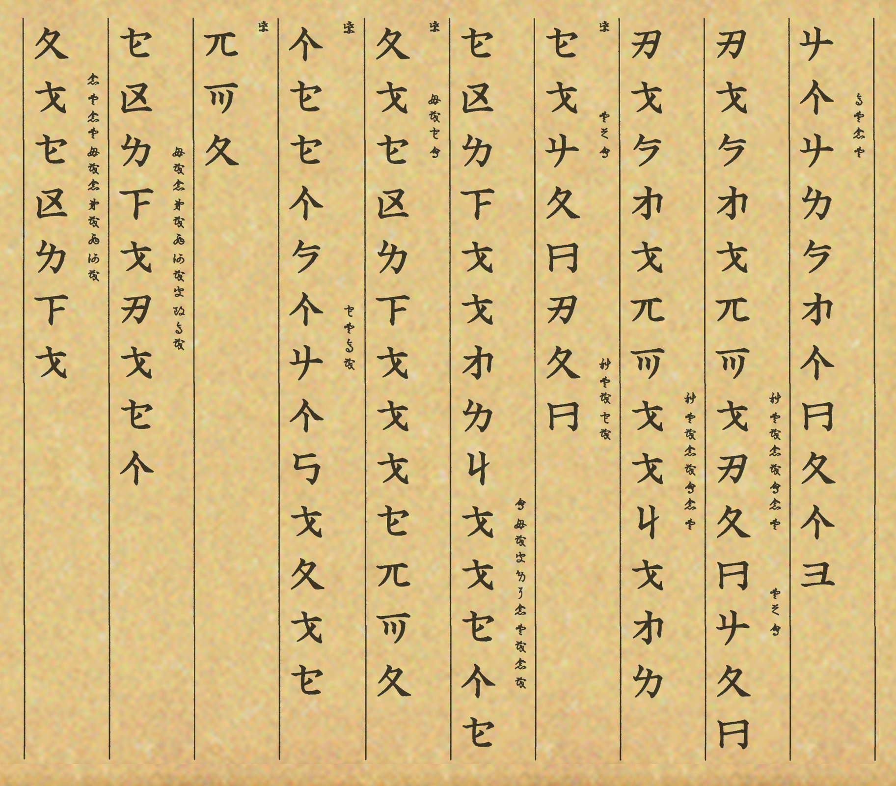 La seconde particularité que présentent ces textes est qu’on ne sait pas toujours exactement à quel endroit les enchâssements minuscules s’insèrent dans le flux de la continuité graphique majuscule, en particulier en cas de développement parallèle des deux flux ; il n’est donc pas vrai d’affirmer que les « expressions minuscules » doivent toujours être lues entre deux mots du flux minuscule ; on peut aussi bien considérer qu’elles accompagnent, ou répondent à tous les mots majuscules qui se trouvent en vis à vis.