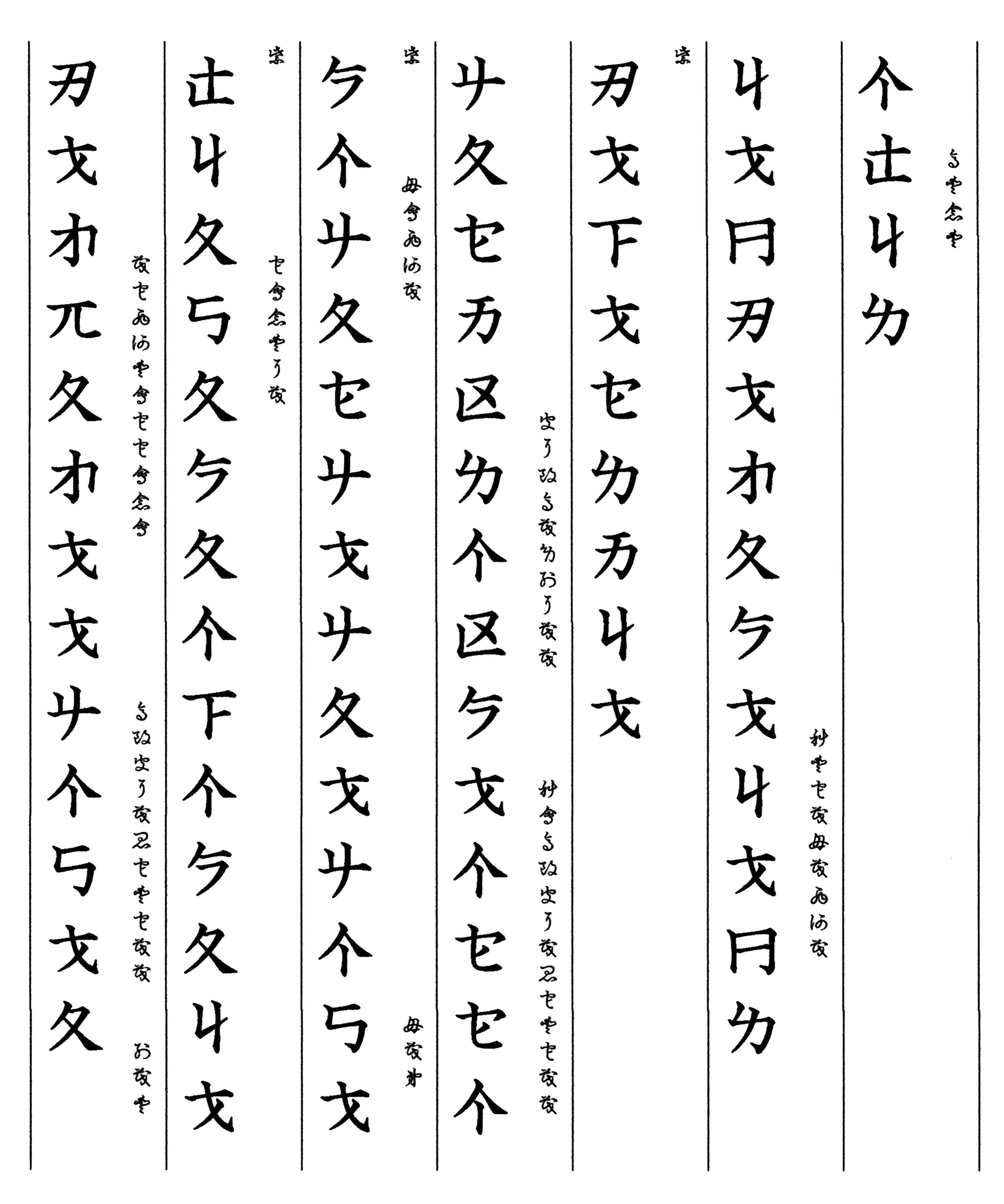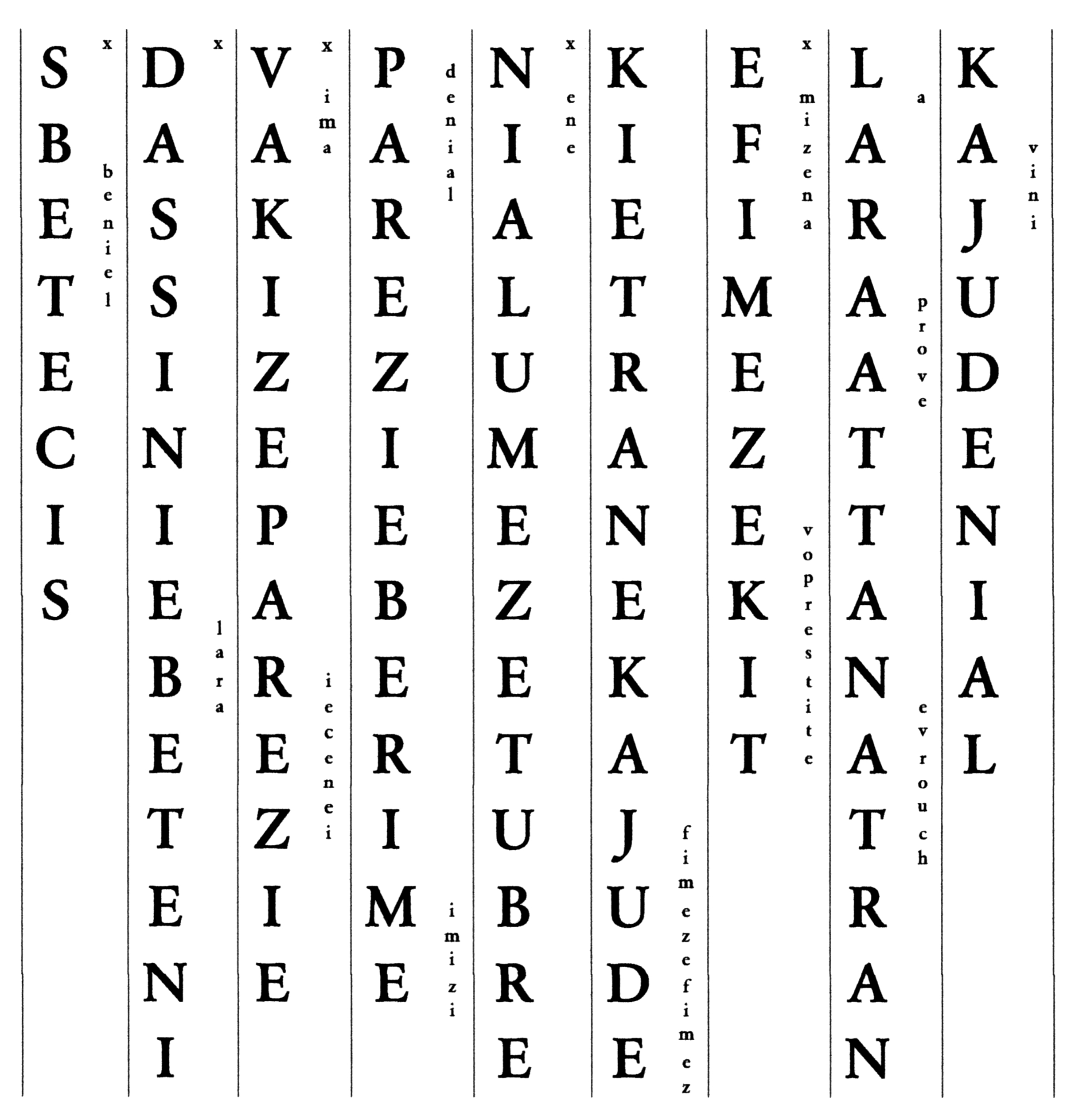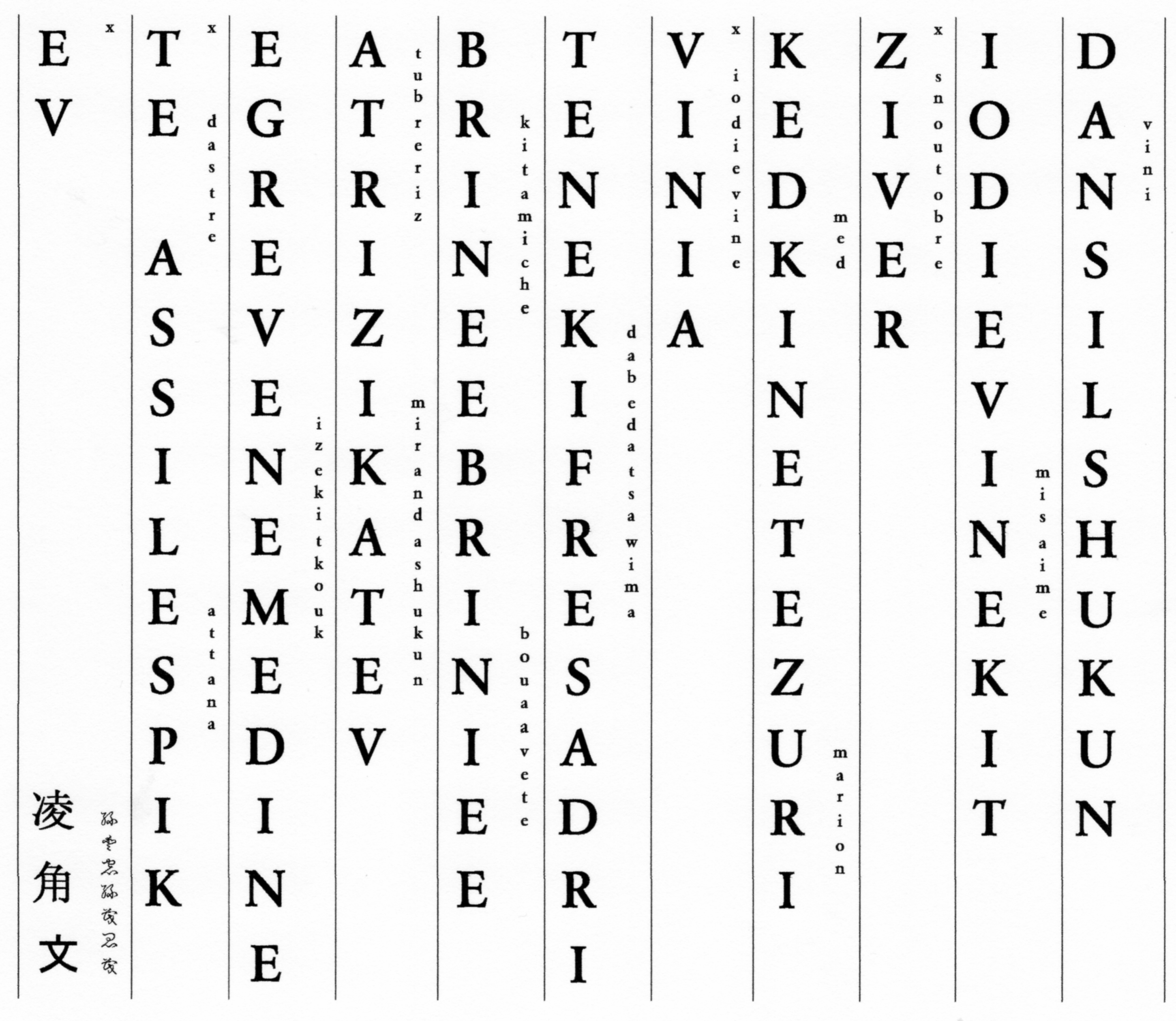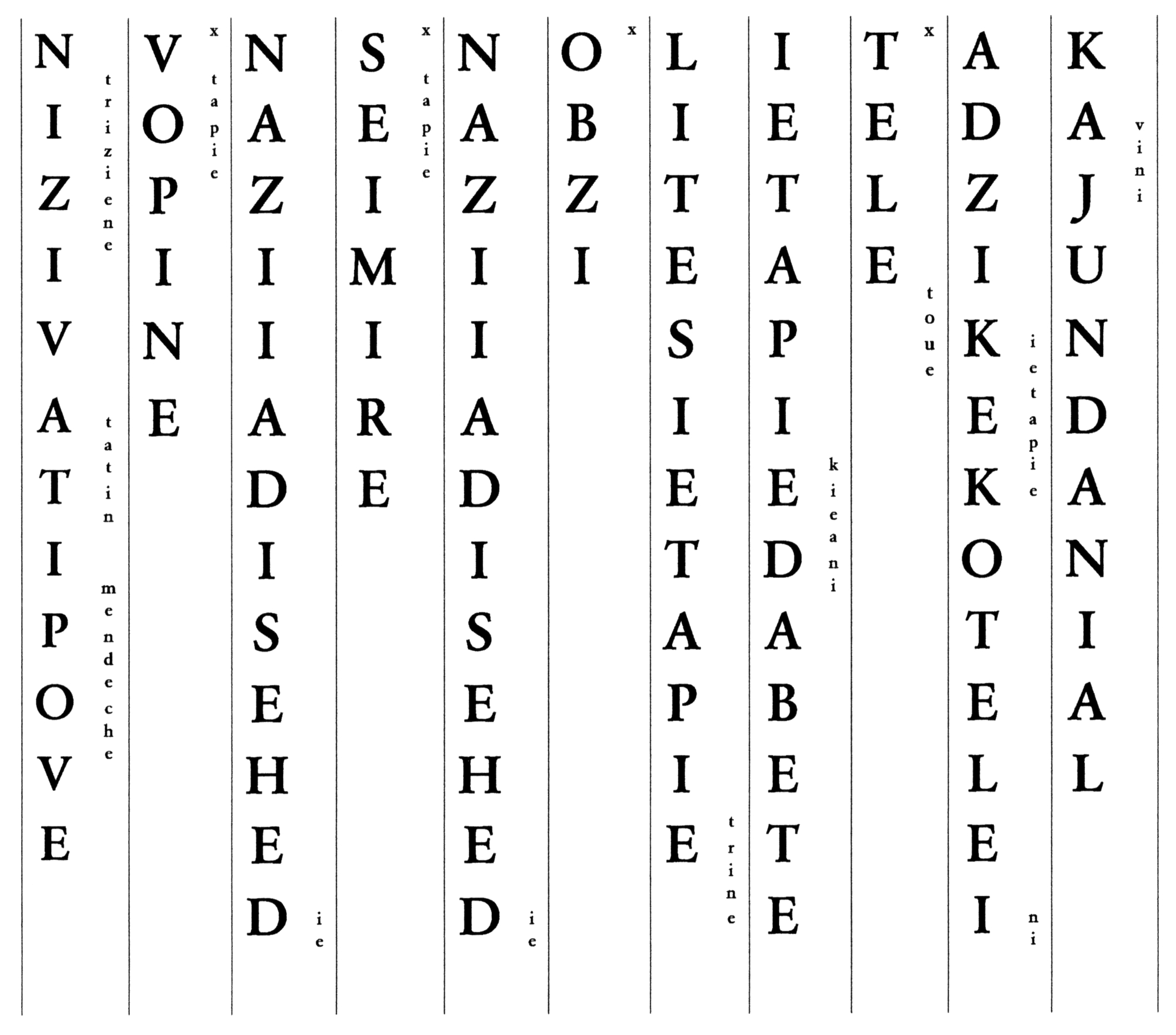 — Les mots et les groupes propositionnels sont, dans les colonnes majuscules, collés les uns aux autres pour former des « versets », équivalents, mais équivalents seulement, à des « phrases » ou à des « propositions » ; ils sont en revanche comme saupoudrés de manière discontinue (à la manière de notes marginales, de gloses ou d’appendices[1]) dans les colonnes minuscules.