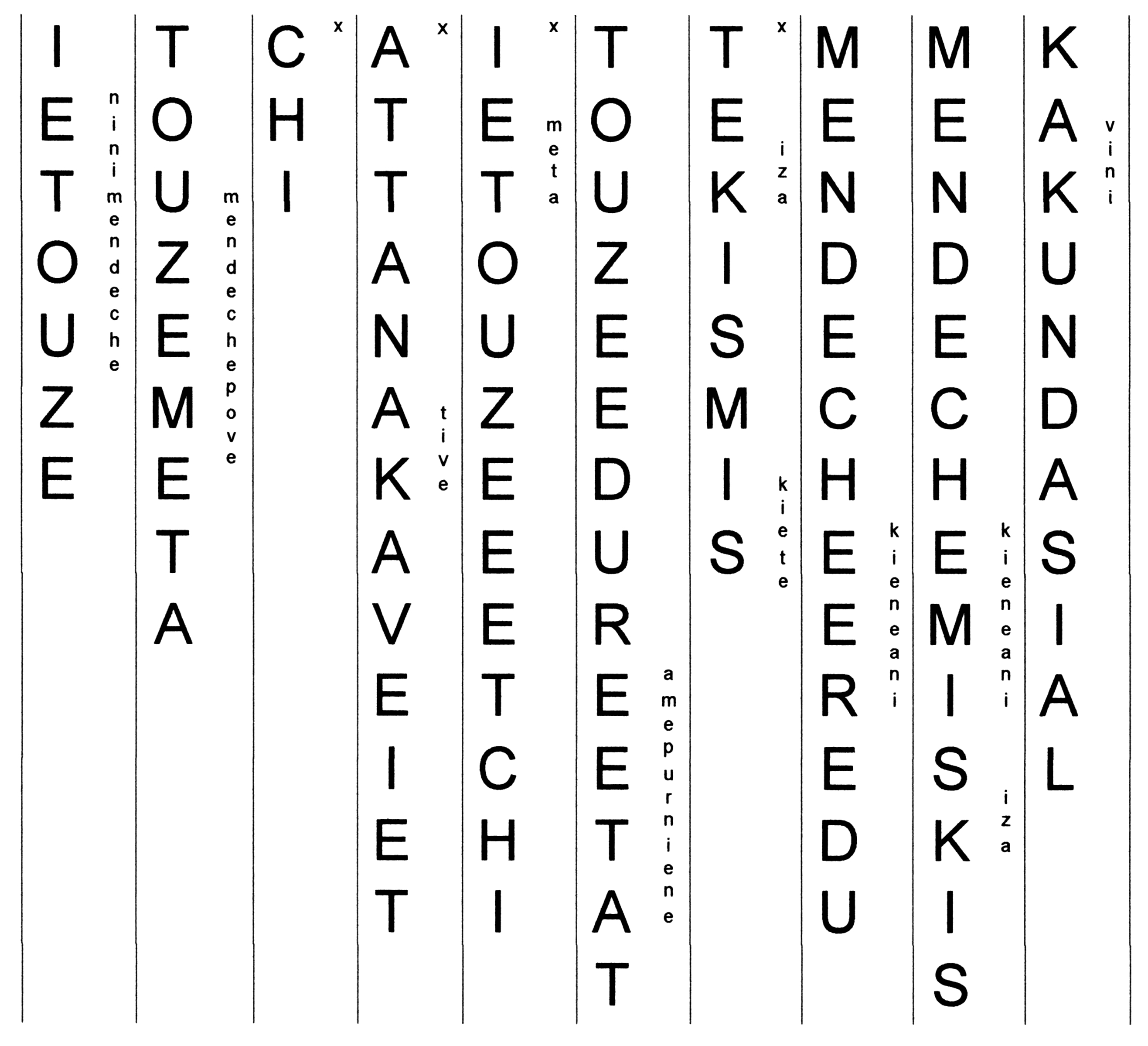 a) Comme les mots-phrases agglutinés qui figurent dans les colonnes majuscules ne font jamais tout à fait sens (et parfois même n’ont pas de sens du tout), il est dans tous les cas nécessaire d’intégrer la totalité des « fragments minuscules » au texte d’ensemble, en tenant soigneusement compte de leur situation relative par rapport à la colonne majuscule. Cette alternance de sens entre colonne majuscule et adjonctions minuscules constitue une forme particulière de parataxe (assez proche de ce que l’on trouve dans les seuls deux textes « ultramartiens » qu’Hélène Smith nous a transmis) ; je l’appellerai ici l’enchâssement simple, ou la parataxe alternée.